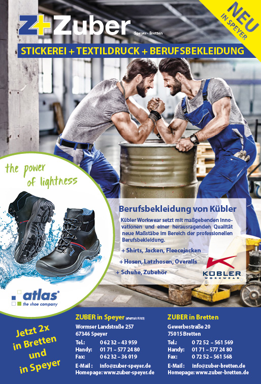 + Seit über 15 Jahren bietet die Fa. Zuber Dienstleistungen und Produkte im Bereich Stickerei + Textildruck + Berufsbekleidung an. Durch den großen Erfolg und die positive Resonanz unserer Kunden starteten wir 2016 kräftig durch. Ab da bietet die Fa. Zuber Stickerei seine Dienstleistungen und Produkte auch über dem Rhein in einer zweiten Filiale in Speyer an - durch die Übernahme der Firma .